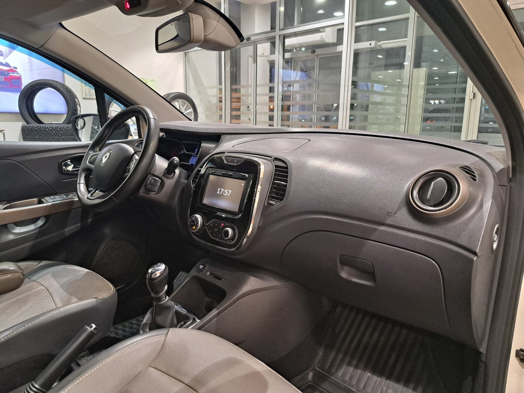 руль, подлокотник и карта дверей отделаны бежевой кожей с прострочками;